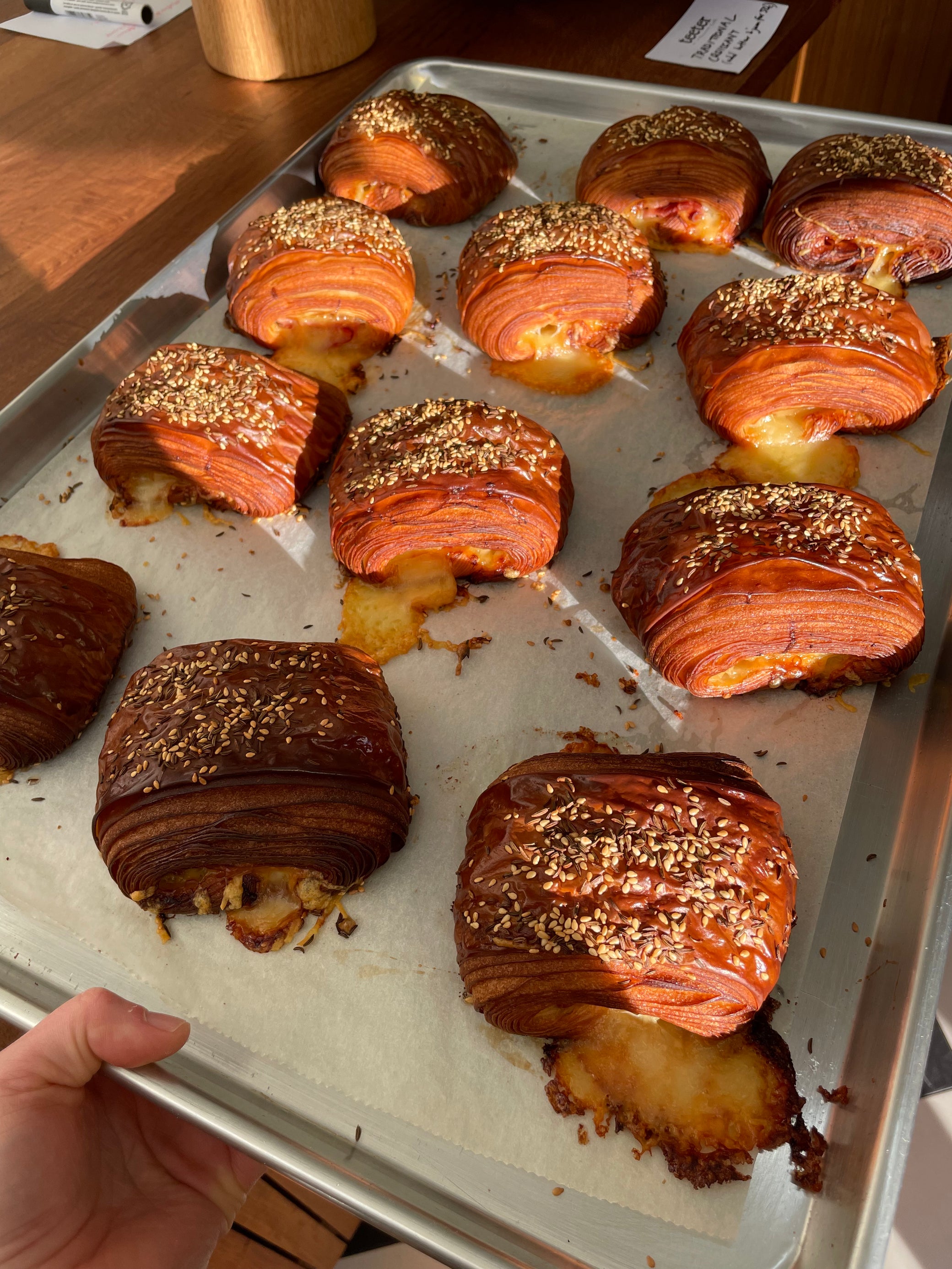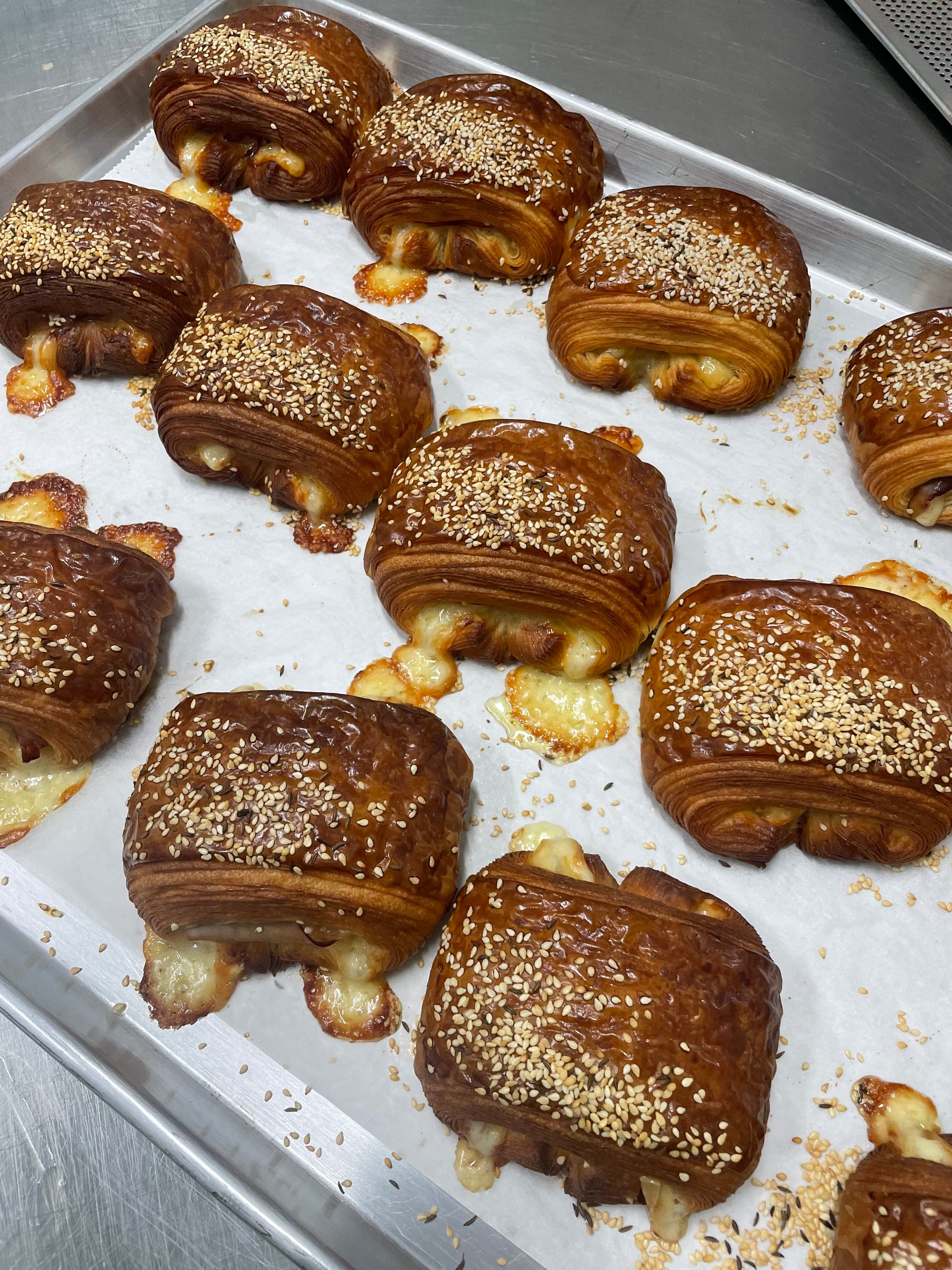 Nitrate free ham, swiss gruyere and raclette cheese, a small spread of horseradish cream in our croissant dough. Sesame and Caraway seeds.